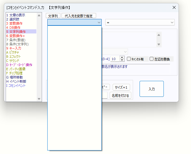 >>3 ●【文字入力可能プルダウンメニュー/調整】 「DB操作」コマンド欄と、「コモンイベント」コマンド欄の 文字入力可能プルダウンメニューでマウスホイール操作をしたとき、 従来は(他にフォーカス合わせた後だと)毎回ゼロ位置に戻ってしまっていたのを、 なるべく「同じ名前がある位置」を基準に上下操作できるよう修正 → 説明画像ありがとうございます。 昔挫折したのですが、いま挑戦してみたらある程度それっぽい挙動があっさりできてしまいました。