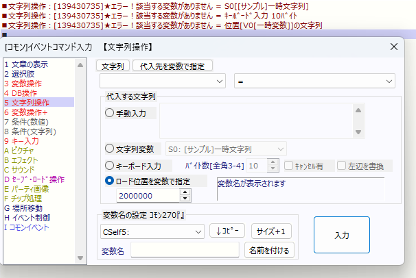 ●【文字列操作/仕様変更】隠しコードの「<<DELETE_EVENT_ID>>」と 「<<SET_EVENT_NAME_ID=?>>」に成功したとき、 「<<OK>>」でなく「1 <<OK>>」を返すように修正 → 成功時は数値変換時に「1」を得られるようにする原則に反していました。 → なお、失敗時は数値変換したときに「0」または「-1」を得られるのが標準動作です。 (たとえば<<Error>>文字列を数値変数に入れると「0」扱いになります)