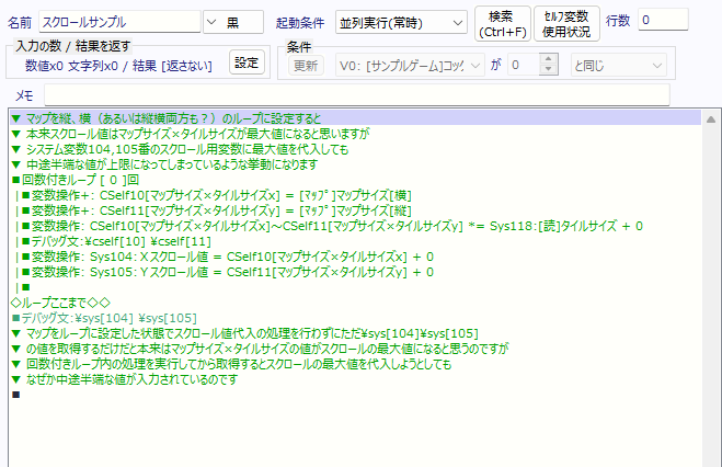 マップの設定にて、マップ自体を縦or横or両方ループする設定にできるのですが、その際のスクロールx,yの値の最大値をデバッグ文章\sys[104] \sys[105]で調べてみたところ、 おそらくマップサイズx,y×タイルサイズがそれぞれのスクロール値の最大値だと推測できます しかし、いざマップサイズx,y×タイルサイズの値をシステム変数104,105に代入してスクロール操作をしようとすると、なぜか中途半端な値が代入されてしまうのです(例 スクロール最大値がx=960, y=640だった場合、システム変数104,105に代入するコマンドを打つとスクロール値x=640, y=401という中途半端な値になってしまう)