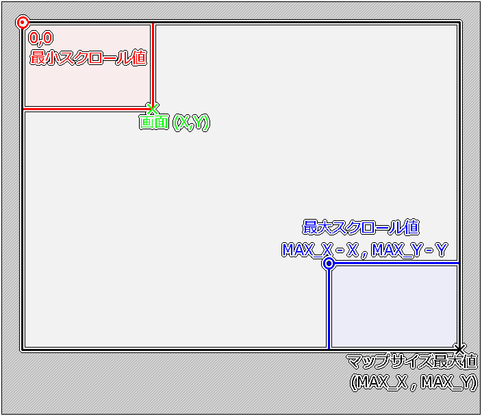 >>424 スクロール最大値は、マップ最大値から画面サイズを引いたものが 最大になっている感じだと思います(大まかなイメージは添付画像参照)。