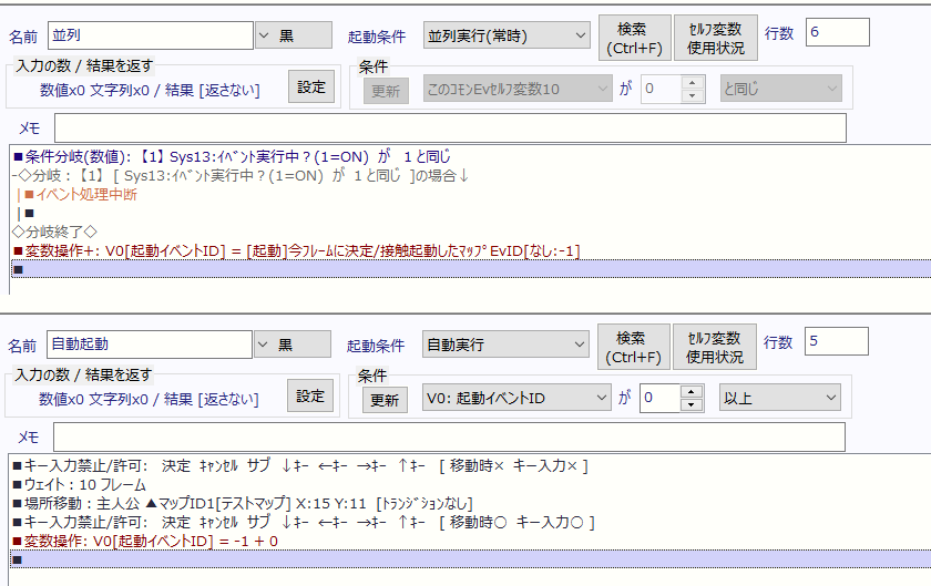 添付の2つのコモンですが、自動コモン内のキーの禁止が間に合わず、キャラクターが場所移動をする前に一歩動けてしまいます。 マップイベントの設定は『プレイヤーから接触』、中身はからの状態です。