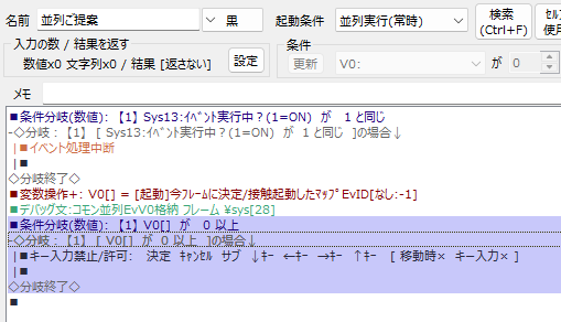 【2フレーム目の挙動】 3.自動コモンイベント:V0が0以上になったのでイベント起動し、移動キー処理を禁止する