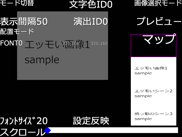 [1] メッセージウィンドウ拡張コモン [ message.zip: 6.09KB ] 【説明】 【1】 基本システムにも空データにも使えるメッセージウィンドウ改変セットです。 既存の改変コモンを私自身に合ったかたちに組み直したものです。 スクリーンショットのように顔グラの位置を左中右、ウィンドウを上中下に切り替えることができます。名前の表示位置は顔グラとウィンドウの位置に合わせて移動します。また、名前のウィンドウは表示する名前の長さに合わせて自動で伸縮します。 その他、機能について詳しくは付属のReadmeを御覧ください。 バグ報告・利用報告をいただけると大変助かります。 2011/07/24 更新。いろいろ改良。ややこしい項目削除。わかりやすく。 【一言】 (→コメントを書き込む) [10/24 01:34] des お借りします。 [12/31 20:06] とうがらし 使わせて頂きました! [10/15 10:31] ユービィ お借りします! [08/26 10:59] パプト マニュアルが文字化けして見えません説明ください [10/04 20:08] レイマスター 使わせていただきます [03/22 09:36] さくしゃ smri様、ものすごく今更ですが返答させていただきます。ウディタを起動して、ゲーム設定→ゲーム基本設定を開く→使用フォント→サブ1を空欄にするか日本語で表示できるフォントに変えてみてください。 [03/22 09:33] さくしゃ smri [03/19 21:45] smail おかりします! [07/19 20:31] まぐなむきらー 仕様させていただきますすすすすす [04/22 20:16] smri 顔グラは無事表示されるのですが、名前が文字化け?してうまく表示できません。解決法を教えていただくと助かります。 [04/22 20:14] smri 連投すいません [04/22 20:14] smri 使わせていただきます! |